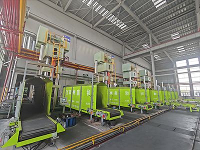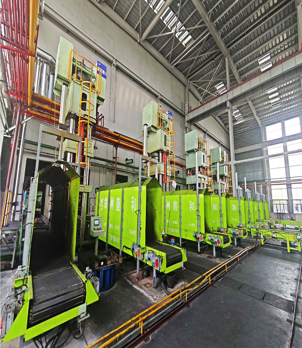 坩堝成型車(chē)間,該生產(chǎn)線(xiàn)配備兩臺(tái)坩堝成型主機(jī)、保溫下料溜槽、冷卻降溫輸送機(jī)構(gòu)及堝內(nèi)