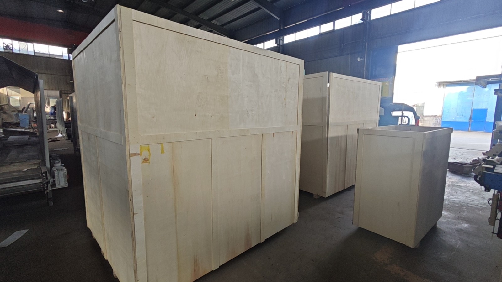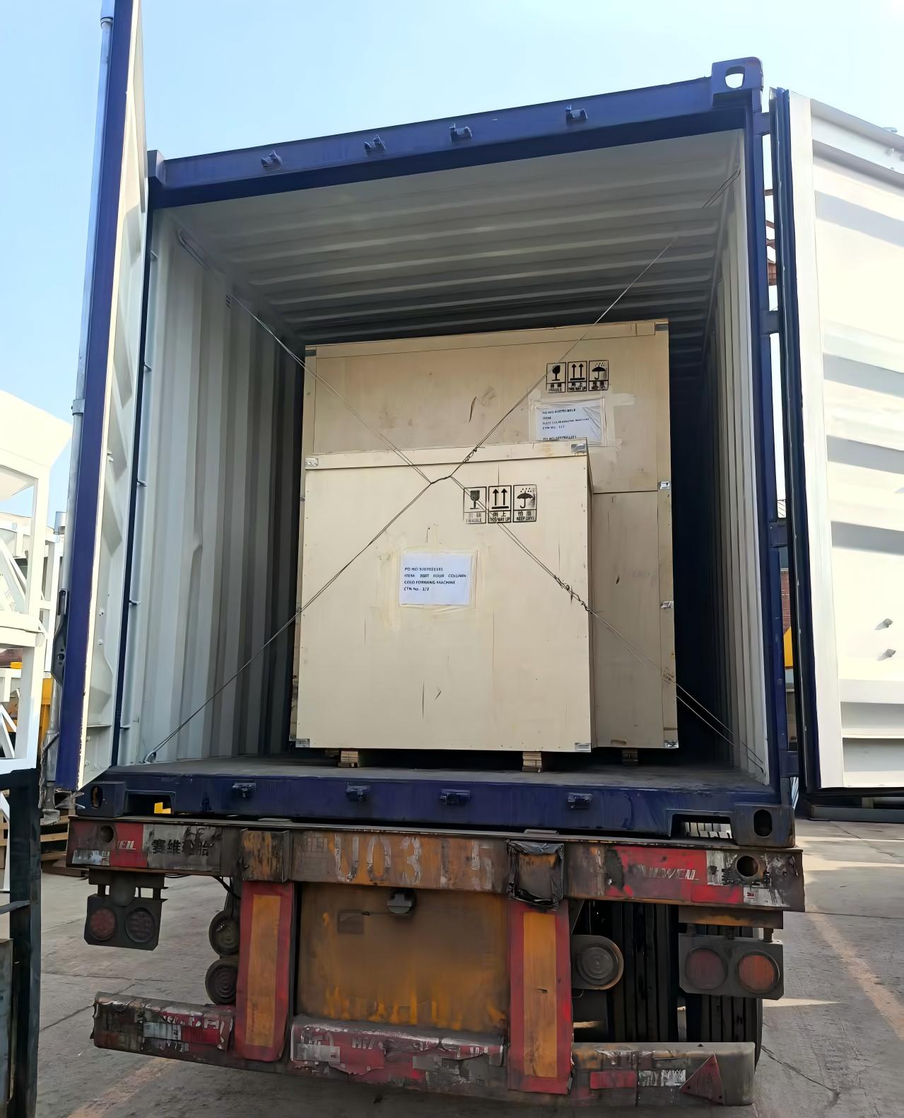 出口印度一臺120T熱壓機+一臺200T冷定型壓機+一臺冷水機裝箱發(fā)貨。